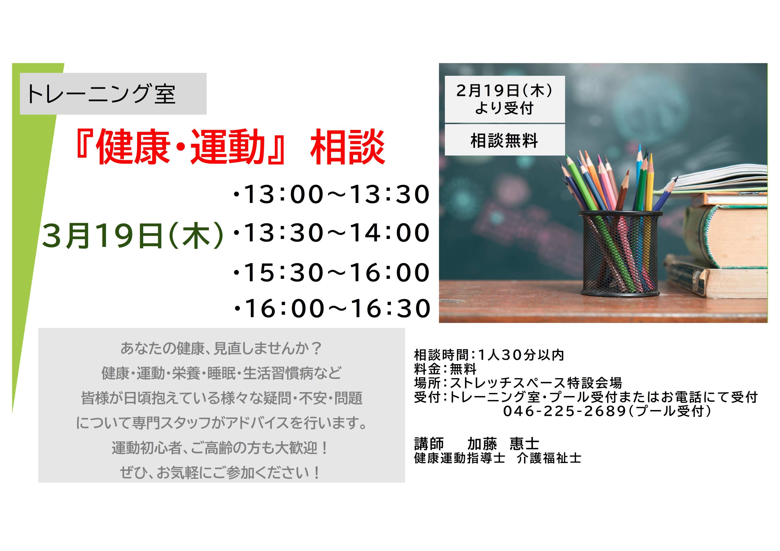 下記の日程で「健康・運動」相談を開催します!