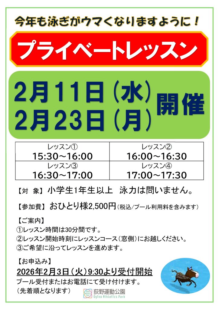 ご好評につき、2月11日(水・祝)、2月23日(月・祝)に完全マンツーマンのプライベートレッスンを実施します。より深く泳法を学ぶことができます!ぜひ、参加をご検討ください!!