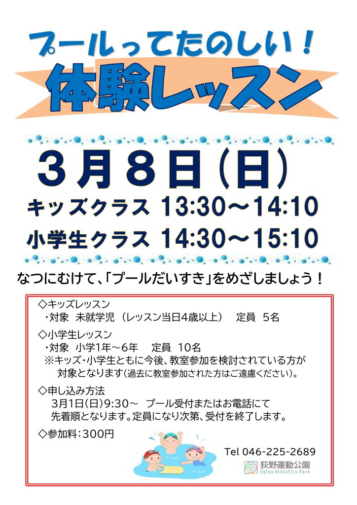 【教室情報】3/8プール キッズ・小学生体験レッスン開催! Posted 2026-02-13 by Ogino-Park プールにて体験レッスンを実施します!詳しくは下記をご参照ください。お申し込みは先着順の予約制で、プール受付もしくはお電話にて承ります。 ☎046-225-2689