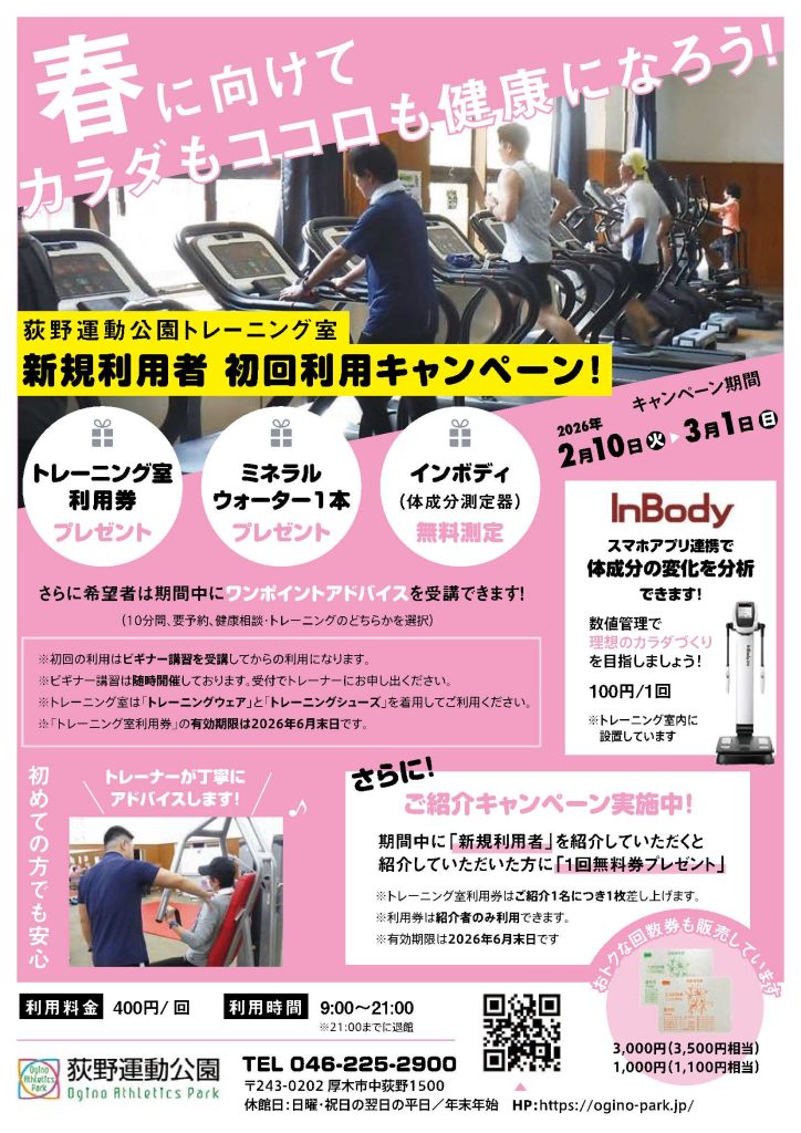 期間中に荻野運動公園トレーニング室を新規利用した方には下記の特典があります!