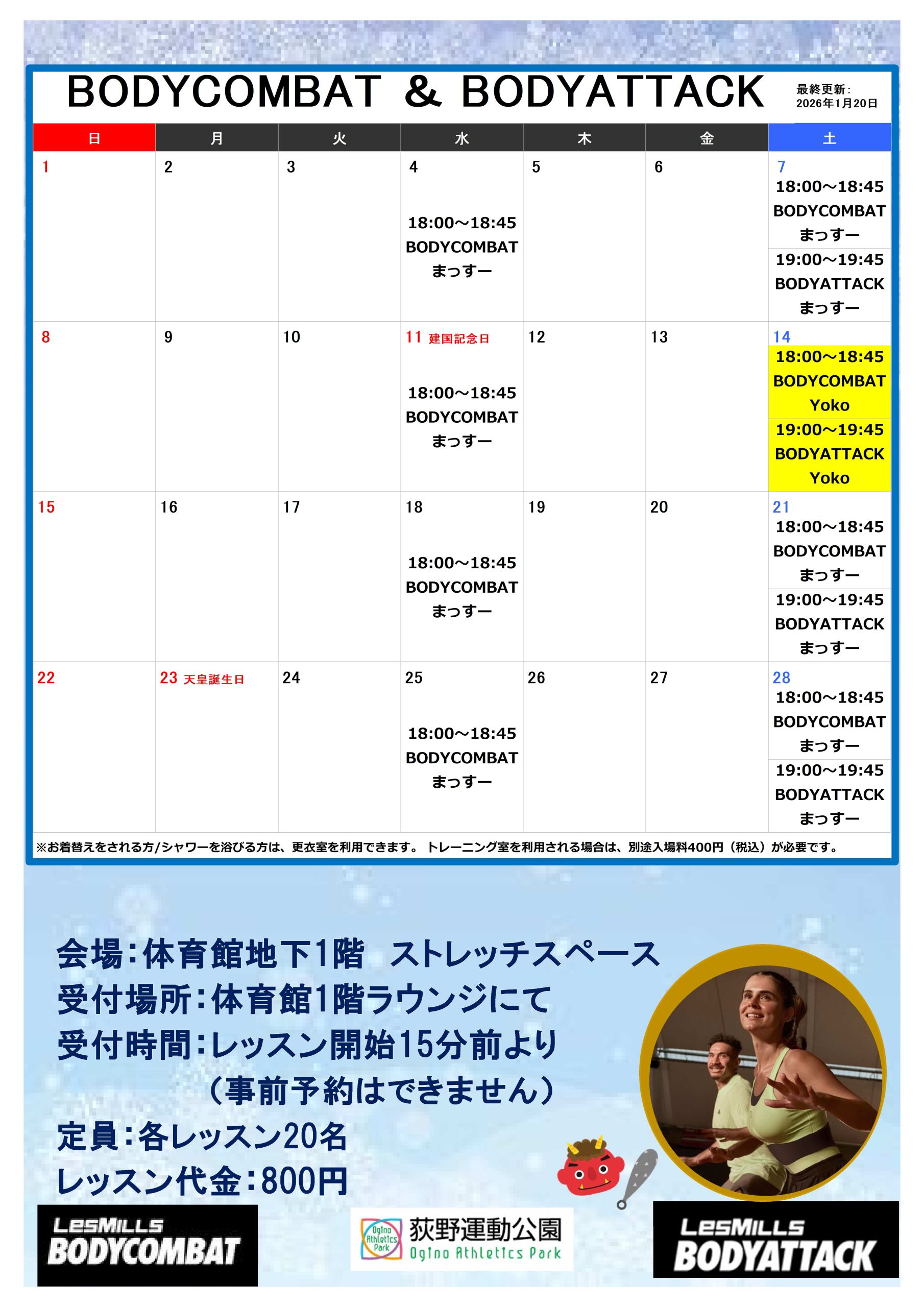 2026年2月 レッスンスケジュール BODYCOMBAT&BODYATTACK