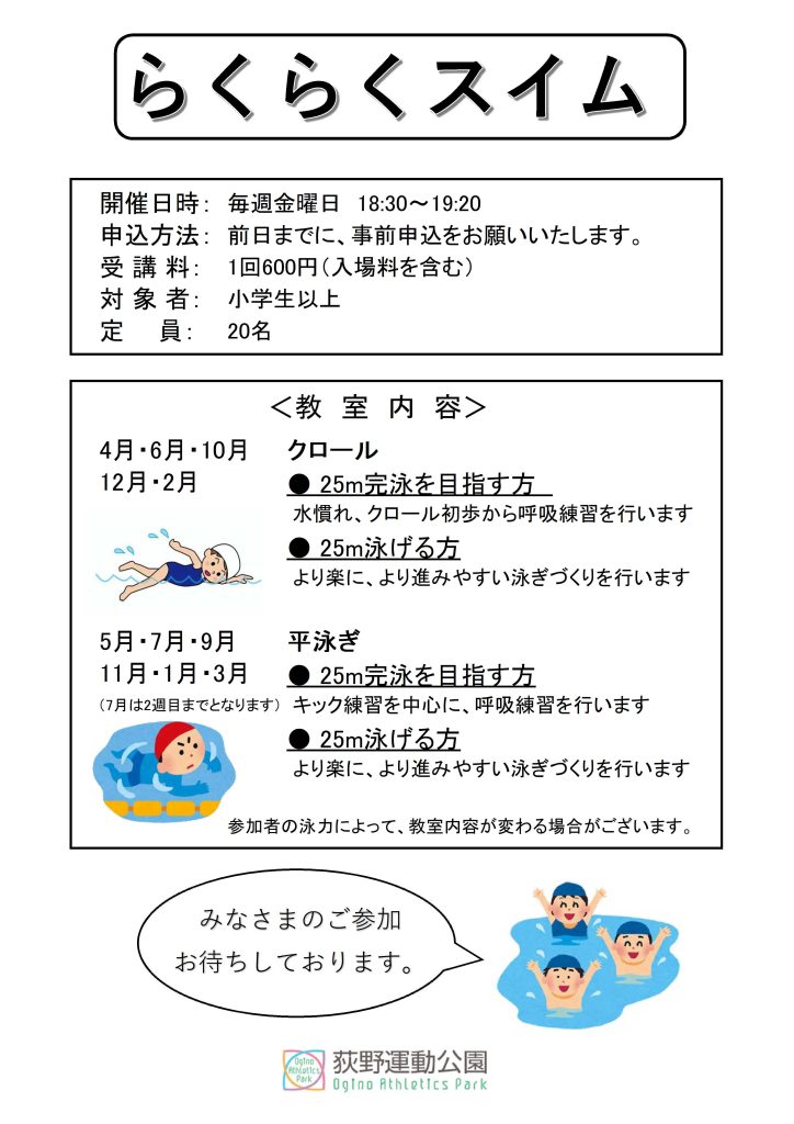【教室情報】らくらくスイム 参加者募集 Posted 2025-07-30 by Ogino-Park 月ごとにテーマを設定して泳ぎ方を指導するらくらくスイム。みなさまのご参加をお待ちしております! ■開催日時:毎週金曜日 18:30~19:20■受講料:1回600円(入場料含む)■申込方法:前日までに電話もしくは窓口でお申込み■問合・申込:☎046-225-2689
